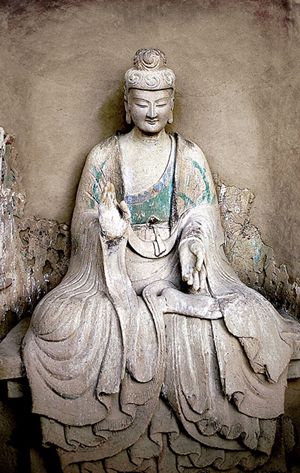 这是一尊微笑的佛。佛经上说,佛祖说法,常常面露微笑。这尊佛像的笑意不仅荡漾在脸上,而且传到全身。微笑的面容和全身柔和的线条呼应,表现佛的大度、从容和飘逸。这组佛像创作的时期,正是中国历史上最惨烈的时期之一,无休止的战争戕害着人类的生命,人们生活在风雨飘摇之中。这组佛像以大度和微笑面对世间,给人一种生命的信心。