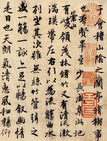 这件书法作品透露出活泼的趣味,字里行间有一种流荡回环、参差错落的美,显示出飘逸不凡的气质,受到历代书家的喜爱。据说,唐太宗非常喜欢这件宝贝,死后把它作为殉葬品,《兰亭集序》的真迹因此而不传,现在人们所见的都是这件书法的摹本。即使如此,也没有减轻人们对这件书作的膜拜之情,它滋育了一代又一代中国书法家。