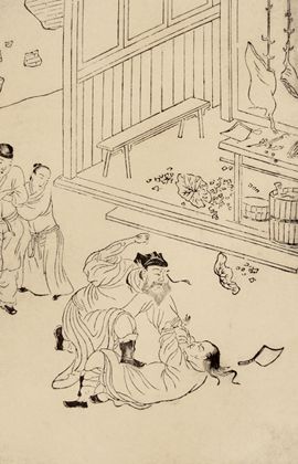 《水浒传》描写这些英雄人物的性格,有两种不同的情况。一种英雄人物的性格特点,自始至终,没有多大变化。如鲁智深,从一出场,就是“遇酒便吃,遇事便做,遇弱便扶,遇硬便打”,从不考虑个人的得失。还有一种英雄人物的性格特点,则是随着他本人的遭遇和命运的变化而逐渐发生变化。林冲就是后面这种情况的一个典型。林冲是一个高级军事教官,“八十万禁军教头”。一开始高俅儿子高衙内调戏他娘子,他采取委曲求全的态度。但是高俅并没有放过他,先是设计陷害他,把他发配沧州,接着又收买押送公人董超和薛霸,要在野猪林中结果他的性命。林冲还是一忍再忍。但是高俅一步步把他推上绝境。林冲到沧州牢城营后,管营分配他看守草料场。谁知这又是高俅的爪牙陆谦的阴谋。林冲到草料场后,在一个大雪天,陆谦一伙放火烧了草料场,要把林冲烧死。林冲长久郁结的一腔怨火终于暴发,他冲出庙门,手拿尖刀,杀死陆谦等人,在大雪纷飞中走上了“逼上梁山”的道路。林冲的故事,把“乱自上作”和“逼上梁山”这两句话表现得最为淋漓透彻。