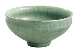 哥窑(浙江龙泉)是宋代诸窑中追求开片的典范。上海博物馆藏有两件哥窑瓷,开片很美,都是宋代作品,一件是葵口碗,一件是轮花碗。两件藏品碗口自然如花,开片细密,纵横有致。台北故宫博物院藏有一件元代哥窑鱼耳炉,在米色釉上,有细碎的开片,裂纹就像一片树叶上的纹理,渐渐伸展,脉络相连。藏于台北故宫博物院的哥窑米色三足炉,也是一件著名的作品,系南宋时作品。釉质不透明,纹理纵横,古朴天然,如同一件远古时期的法器。