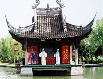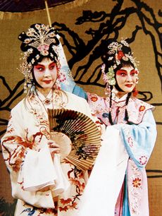 再一个是《秋江》。这是从川剧移植过来的。这出戏描绘年轻尼姑陈妙常离开尼姑庵去追赶她的情人潘必正,遇大江挡住去路。陈妙常央求一位老艄翁驾船载她追赶潘必正。舞台上既无水又无船,但通过两位演员的表演,观众明明看到满台是水,二人在不断摇晃的小船上往前追赶,陈妙常十分焦急,老艄翁却不断和她调侃,妙趣横生。