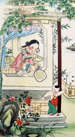 年画的喜庆气氛,在杨柳青年画中体现最为充分。这里出品的年画清新活泼,具有浓郁的生活情调。如一幅《母子图》,画湖边的庭院,院子里有湖石假山、花卉,妈妈站在窗前,拿着扇子,招呼着窗外嬉戏的儿子。胖胖的小家伙穿着小肚兜,一只手拿着一个小木棍,木棍的顶端有一只小鸟。一片祥和温暖的气氛,是一幅温情的生活画面。