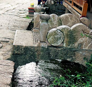 但凡民居,由于属于聚居之地,水系的安排极为重要,在没有自来水的时代,人们用各种办法来处理水的问题。徽州民居村落一般都依山而建。引山泉到村前,到门口,是很多徽州民居的特点。入选世界文化遗产的徽州民居代表之一的宏村,就是以其独特的水系而享誉世界的。这个有数百户人家居住的村落,是根据牛的形象设计的——农业和牛有极密切的关系。水从后山流出,蜿蜒流淌,穿过道道石桥,穿过户户人家,就像牛的肠子绵延,村中有“家家门巷有清渠”的说法。“牛肠”流入村中的月塘,这里象征“牛胃”。经过“胃”的“消化”过滤后,又绕村串户,绵延流淌,流向村外低处的南湖中,那里就是人们所说的“牛肚”。这一篇水的文章做得很精妙。