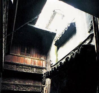 天井,也是徽州民居的特色之一。徽州民居一般有两个院落,一个是室外的院落,一个是室内的院落,室内的院落就是天井。在徽州人看来,天井既可聚水,也可聚气,所以人们常常说它是聚集财富的象征。所以有钱的人家造房,一定要将天井做好。天井是由屋顶四周坡屋面围成的一个敞顶式空间,就像是天的“井”,所以叫天井。因为这种漏斗式的设计,四周房顶的雨雪水,就会落到内院中。人们在这里建有鱼池,放上盆栽。在一个避风的地方,养花,观鱼,听雨,以增添生活的乐趣。