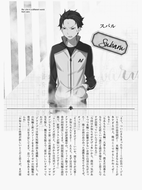 【在alive上也有每个月的短篇小说连载,把那些短片和新章节统合起来的RE零短篇集发售也预定在十二月了。都没有喘口气的时间呢】