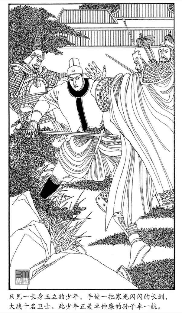 这身长玉立的少年正是卓仲廉的孙子卓一航,他七岁之时,随父亲卓继贤来京,适逢武当派的掌门紫阳道长也来京化缘。紫阳道长剑法天下无双,正想找寻一个有根基的少年继承衣钵。一日来到卓府,见卓一航头角峥嵘,气宇不凡,动了收徒之念。卓继贤以前在湖北为官,曾和紫阳道长有过一面之缘,知他武功妙奥,深不可测,也愿儿子成为文武全材的完人,于是一口答允。紫阳道长把他带回山中,全心教授,又用药物培养他的元气,磨练他的体肤,如是经过一十二年,卓一航已得了七十二手连环剑和九宫神行掌的全部奥秘,本领在武当第二代弟子中首屈一指,甚至比若干师叔还强。在这十二年间,紫阳道长每三年带他回京一次,让他留在家中一月,攻读诗书,在这一月中,卓继贤就请名师宿儒替他讲解经史奥义,满了一月又让他把书本带回山中自习。所以卓一航是文武双修,师父、父亲都极满意。