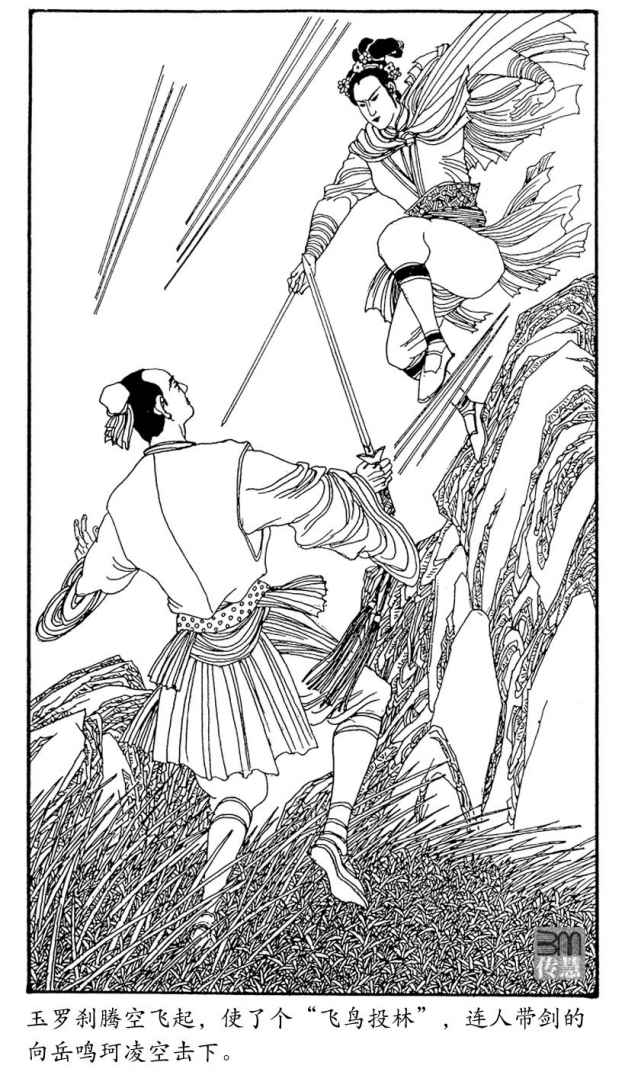 这两人剑法,看来绝对不同,但看得久了,却又颇似有相同之处,那岳鸣珂剑法极杂,看来有峨嵋派、有嵩阳派、有少林派的,还有自己武当派的,所用的都是各派剑法中最精妙的招数,但却都稍加变化,而所变化的又似比原来的剑招还要佳妙。卓一航这一看得益不少,这是后话。而那玉罗刹的剑法,也好像是博采各家,但每一招都和正常的剑法相反,例如华山派中的“金雕展翅”,剑势应是自左至右,平展开来,而在她手中,却是自右至左。又如武当派中的“无常夺命”一招,剑势应自上而下,刺向下盘,在她手中,却是自下而上,刺向中盘。那岳鸣珂应对她的剑招,起初还是以另外的招数化解,例如玉罗刹用武当派的“无常夺命”,他就用雪山派的“明驼千里”,避招进招。到后来竟是用她本来模拟的招数来破她的招数,例如她把“金雕展翅”一招,反转方向来使,他也就用正宗的“金雕展翅”那招,却略加变化,来挡她的剑招。而且尤其奇怪的是玉罗刹每使一招,他都好像预先知道似的,待她一剑刺来,他就恰恰用到她所模拟的那原来招数应敌。因此两人虽然斗得极烈,却是相持不下。正看得出神,忽又听得岳鸣珂喝声:“去!”玉罗刹又飘身退出数丈,正想回身再斗,岳鸣珂叫道:“再斗无益,你的师父现在哪里?她所藏的剑谱是不是都传给你了?你赶快对她说,天都居士等她相会。”玉罗刹倏然收剑,说道:“你的师娘在三年前已去世了!”岳鸣珂大吃一惊,宝剑扬空一劈,叫道:“是谁把她害死的?”玉罗刹道:“她自己走火入魔,撒手西去,与人无尤。”岳鸣珂道:“她的遗体和剑谱呢?”玉罗刹道:“在黄龙洞后洞的石室中,你搬开后洞那两块屏风似的岩石,就找到了。我奉她遗命,在她死后三年的忌日,已将她的死讯,告知了贞乾道长,本想托贞乾道长转告令师,你既来了,就自己去找吧!”