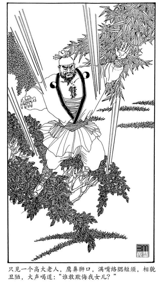 这时已追至城外的清风山脚,那少女边叫边跑上山,玉罗刹如影随形,紧蹑少女身后,长剑晃动,剑尖时不时点着少女后心,看那少女惊惶万状,左纵右跃,总摆脱不了。玉罗刹有如灵猫戏鼠,“玩”得十分高兴,格格地笑个不休。那少女吓得锐声尖叫。笑声叫声杂成一片,蓦然间,少女身子向前一仆,高叫:“爹爹!”山腰处传出一声怪啸,玉罗刹收剑看时,只见一团灰影,似流星殒石般直冲下来,真的是声到人到,玉罗刹横跃两步,只见一个高大老人,鹰鼻狮口,满嘴络腮短须,相貌丑陋,大声喝道:“谁敢欺侮我儿?”那少女满面泪痕,躲在老人身后,撒娇叫道:“爹爹,你替我把这贼婆娘的眼珠挖了!”