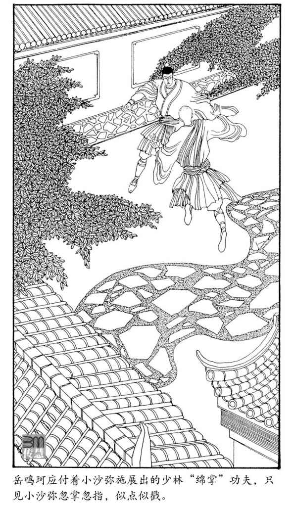 正在思量,罗汉堂内倏地跳出一个沙弥,只有十五六岁光景,身法却极为敏捷,一照面就是一招“阴阳双撞掌”迎面扫来,喝道:“大胆狂徒,敢来闯寺!”岳鸣珂已得镜明指示,知他故意装模作样,假戏真做,暗暗好笑。闪得几闪,正自打不定主意如何闯关,令他好好下台。不料这小沙弥却似十分好胜,竟然施展出少林“绵掌”的功夫,忽掌忽指,似点似戳。卓一航和师叔由达摩院的一个高僧陪着,在石塔上观看,见这小沙弥正是日间向胡迈叫阵的那一个,不觉好笑。卓一航道:“这位小禅师身法好灵,要是日间由他出手,只怕那老无赖伤得更重。”
