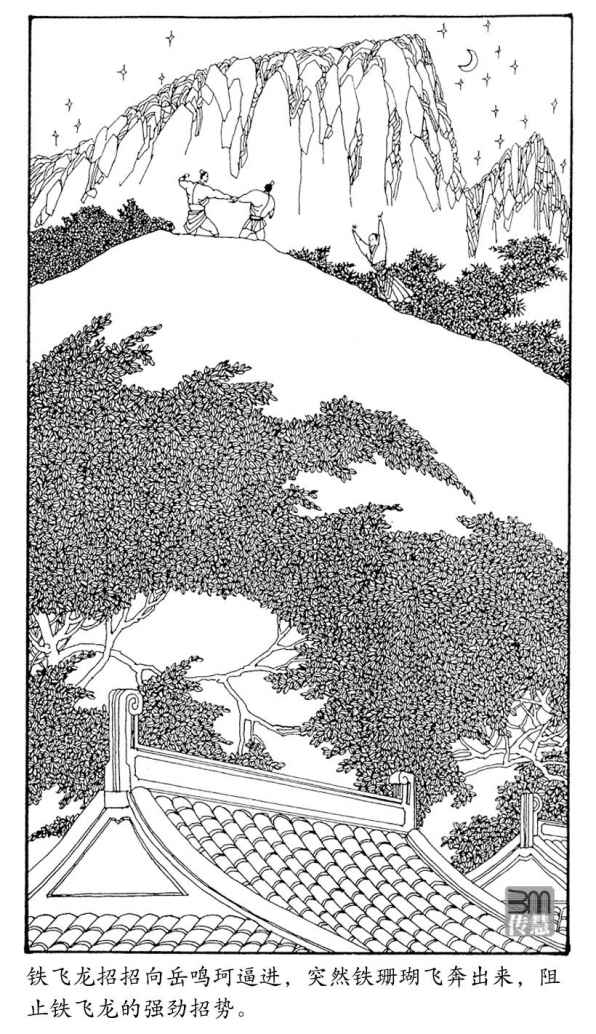 铁飞龙将女儿救出之后,细细盘问,探出女儿的口风,知她对岳鸣珂甚为爱慕。铁飞龙也以为女儿和他已有私情,所以才引起那么深的误会。铁飞龙探出女儿的心事之后,就和玉罗刹商量,玉罗刹自告奋勇,愿作大媒,铁飞龙和女儿躲在林中的大树上听他们谈话,听到后来,他们越说越僵,竟然拔剑动手,铁飞龙沉不住气,挥拳加入战圈,事情越闹越大。