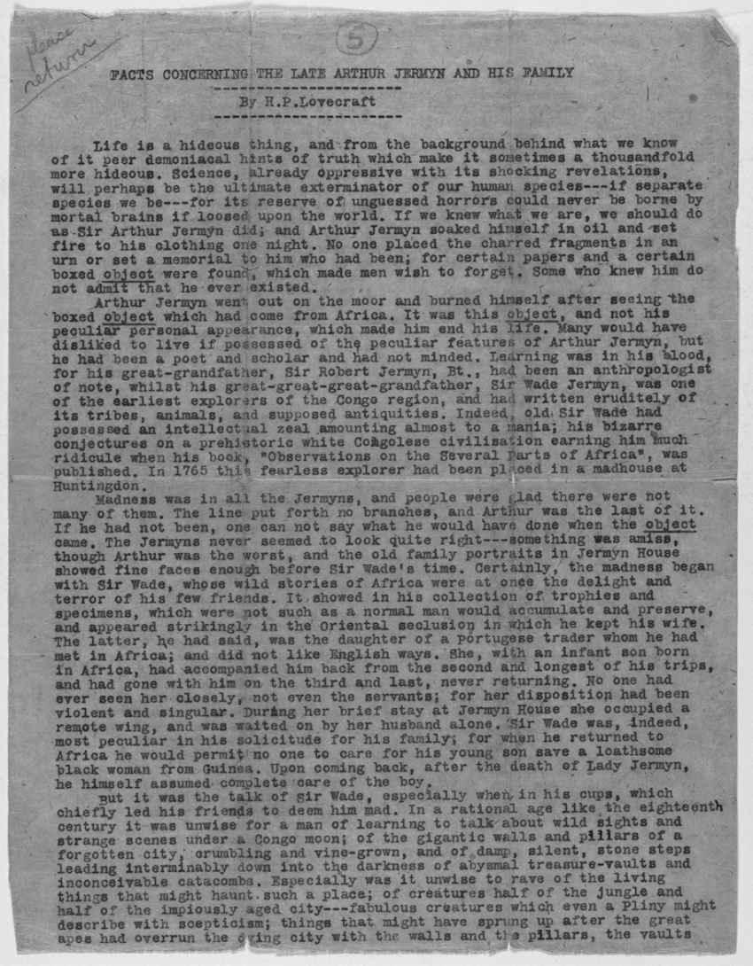 这种单倍行距的打字稿(可能是在1922年或1923年完成的)包含了在1921年的版本中没有出现的修改,是1923年4月末或5月初洛夫克拉夫特提交给《诡丽幻谭》五篇小说打字稿中的一篇。