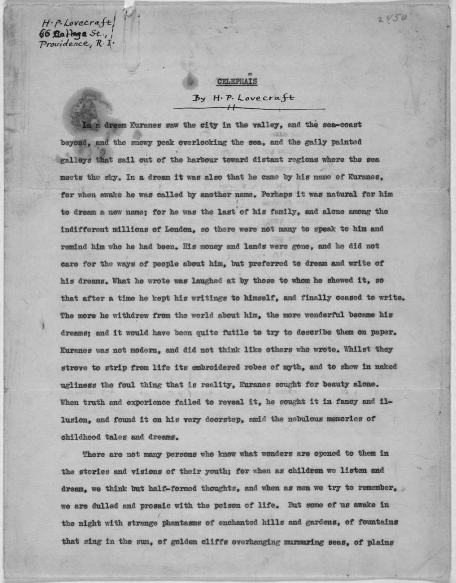 “我在一周前写了《塞勒菲斯》,昨天早上完成了《自外而来》。”(参见1920年11月19日洛夫克拉夫特写给法兰克·贝尔纳普·隆恩的信件)本稿可能是由他人代打的。