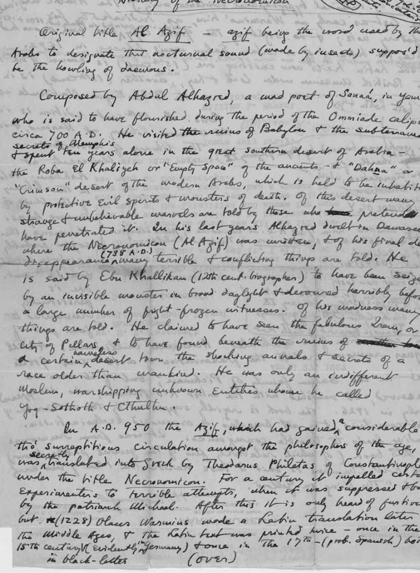 此书由也门萨那的一位名为阿卜杜·阿尔哈兹莱德的疯子诗人编著。据说此人在倭马亚王朝(大约公元700年前后)享誉盛名。他曾走访过古代巴比伦的遗迹以及一些位于孟菲斯城地下的秘密地点,并在阿拉伯南部的大沙漠独居了十年的时间,古时候人们称那片地方为“鲁卜哈利”,即“虚空”,而现在人们称那里为“达哈玛”,即“深红”。据说那片沙漠里生活着许许多多恶灵守卫与致命怪物。那些自称曾经穿越过这片沙漠的人常常会讲述出许多沙漠里出现的难以置信的怪异奇景。在晚年的时候,阿卜杜·阿尔哈兹莱德到大马士革定居,并在那里完成了《死灵之书》的编写工作,随后于公元738年死亡(也有人称他消失了)。书中记载了许多恐怖且自相矛盾的事情。生活在十二世纪的传记作家伊本·赫里康声称阿卜杜·阿尔哈兹莱德最后是在光天化日之下被一个看不见的怪物抓住,然后被活生生地吞噬掉了,有一大群被吓得目瞪口呆的路人目击了此事。有许多事情都能体现他的疯癫。此人自称见过埃雷姆——传说中的千柱之城,而且还在某个无名沙漠小城的地下发现了一个比人类还要古老的种族所留下的令人震惊的秘密与历史。然而,他终究只是个默默无闻的穆斯林,崇拜着某些他称之为“犹格·索托斯”与“克苏鲁”的未知存在。