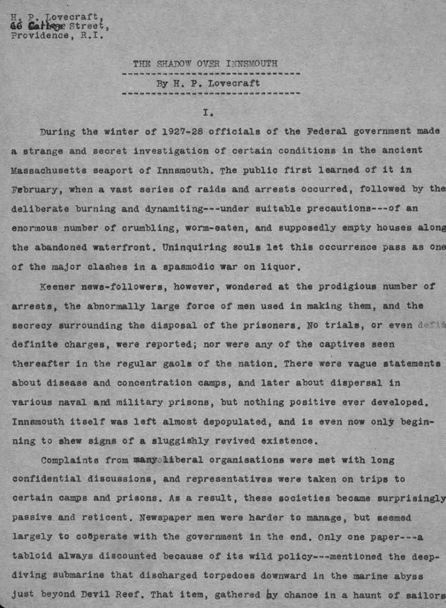 1927年到1928年的那个冬天,联邦政府的官员们开展了一项奇怪又神秘的调查,专门调查了出现在马萨诸塞州的海港古镇印斯茅斯的某些情况。民众们最早在二月听说了这方面的消息,因为当时发生了一系列的大规模突袭事件,很多人被逮捕,惊扰了各方。当局在经过深思熟虑之后,进行了一些适当的预防措施,然后就开始有计划地焚烧或者炸毁了一大批位于荒凉的滨水区的房屋。那些房屋大都斑驳破裂、满是蛀虫,恐怕早已无人居住。那些不好到处打听小道消息的人对此事并不在意,因为当时美国颁布了禁酒令,对酒精宣战,由此引发了一系列间歇性爆发的大规模暴乱,大家都以为这只是诸多暴乱的其中一次罢了。