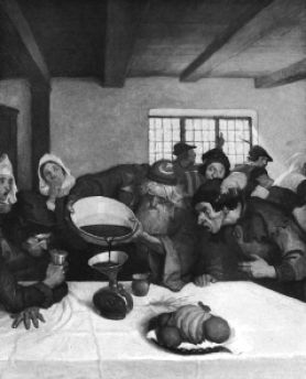 占星师拿起高脚杯喝光了第二杯酒,然后又倒了第三杯。他把瓶子放下,很意外地碰翻了它。他抓住了酒瓶,所以没有泼洒出太多,他把它对着光举起来,说:“多么可惜——这可是国王的酒。”然后,他的脸变得容光焕发起来,涌现出胜利的喜悦,或者诸如此类的神情,他说:“快!拿个碗过来。”