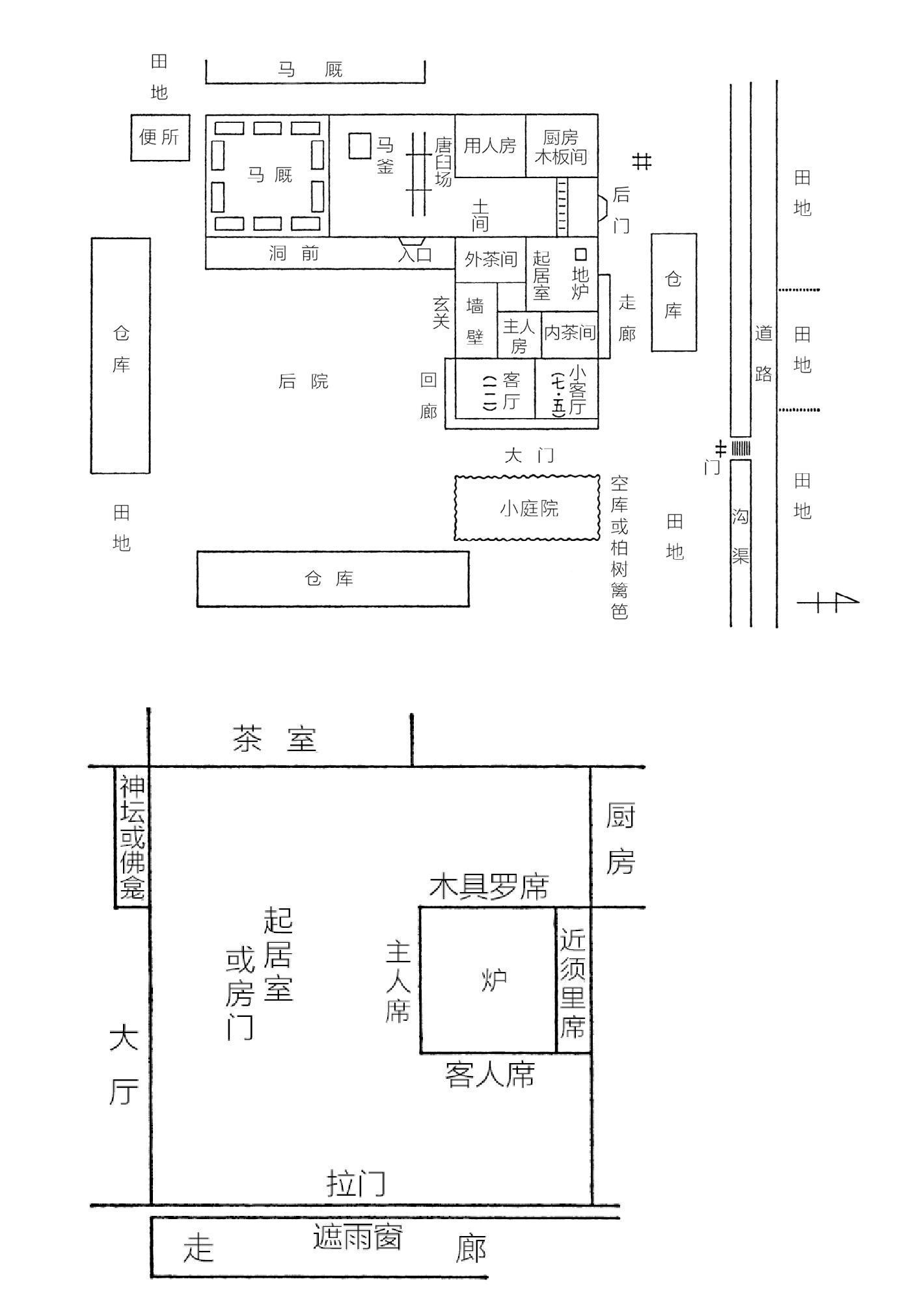 当地人称大门为“城前”,屋子周围是田地,大部分都不会设围墙、篱笆等地界。主卧室和叫作“内室”的起居间之间有个小房间,这房间非常狭窄,而且没有窗户,一片阴暗,叫作“座头房”(译注:座头是日本中世及近世,做僧人打扮的盲人。一般从事琵琶、古筝表演工作,或按摩、针灸等职业)。