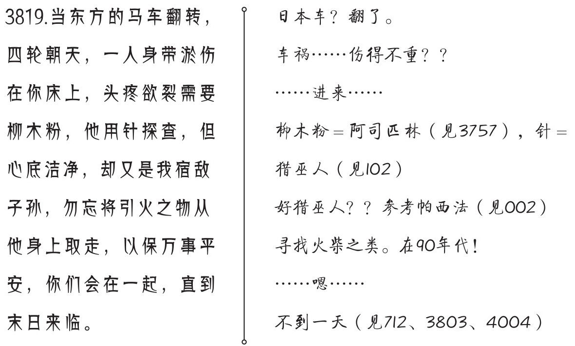 “是她写的。嗯,最初是她写的。这是初版于1655年的《艾格尼丝·风子的精良准确预言书》中第3819条预言。”