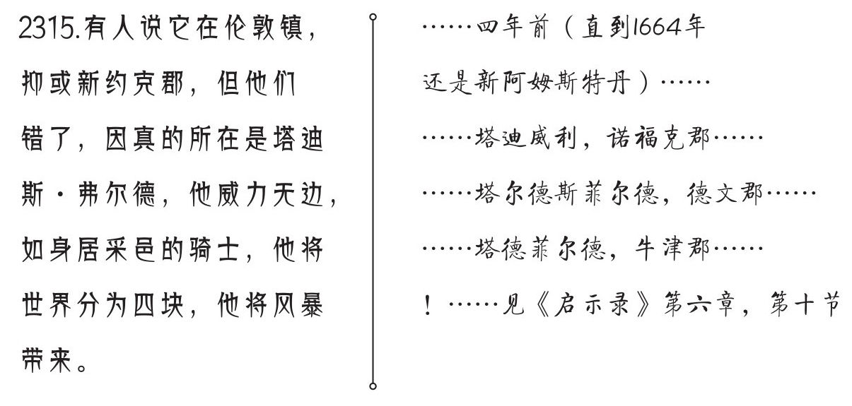 他瞅了一眼安娜丝玛的笔记本。这地方肯定有点不对劲,就算刨去如今似乎已经在全球范围肆虐的UFO和西藏人也一样。塔德菲尔德不仅拥有可以校准时令节气的标准气候,还有极强的抗变化力。唯一一所小笼圈养式农庄没两年就垮了台,被一所老式养猪场所取代,这个农场主让他的猪在苹果园里自由奔跑,并加价出售猪肉。本地的两所学校也十分固执,似乎对教育方式变革有极强免疫力。一条本可以将下塔德菲尔德变成“18号岔路口—快乐小猪休息站”的高速公路,在五里外拐了弯,绕过巨大的半圆然后继续前进,完全没有影响到这个永不改变的乡村孤岛。谁也不知道个中缘由。第一名调查员精神崩溃了,第二名做了修士,第三名跑去巴厘岛画裸女。