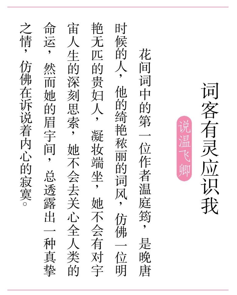 花间词中的第一位作者温庭筠,是晚唐时期的人,他的绮艳秾 丽的词风,仿佛一位明艳无匹的贵妇人,凝妆端坐,她不会有对宇宙人生的深刻思索,她不会去关心全人类的命运,然而她的眉宇间,总透露出一种真挚之情,仿佛在诉说着内心的寂寞。