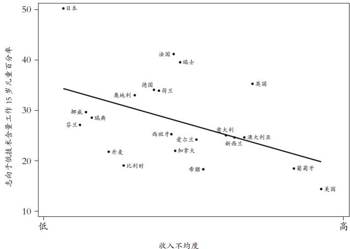 图表8.6:富裕国家的不平等状况与15 岁儿童的志向。