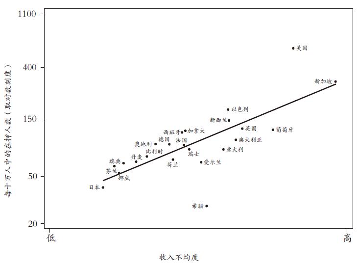在美国,每10万人中就有576人在监狱中,这是英国在押人数比例(每10万人中有124人)的4.5倍,是日本(每10万人中有40人)的14倍多。即使把美国和新加坡当作离群点,将其排除在外,不平等与在押人数比例之间的关系对于其他国家依然成立。