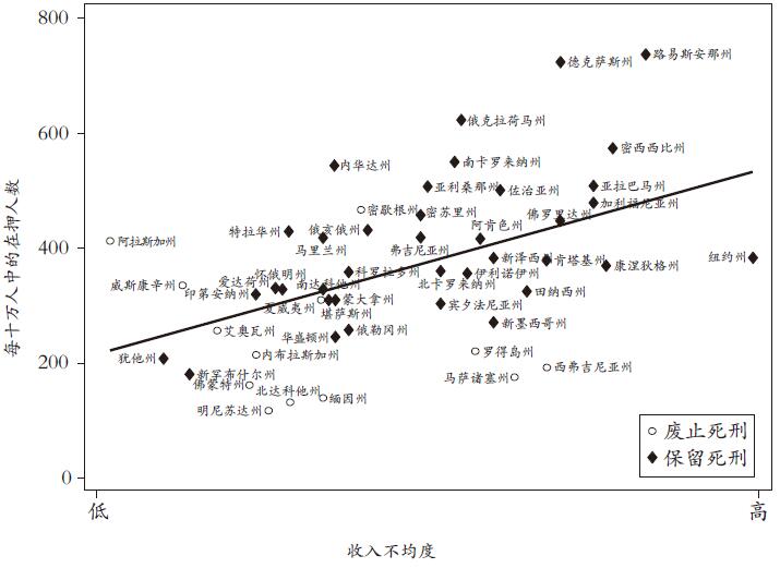 图表11.2:更加不平等的美国各州在押人数比例也更高。