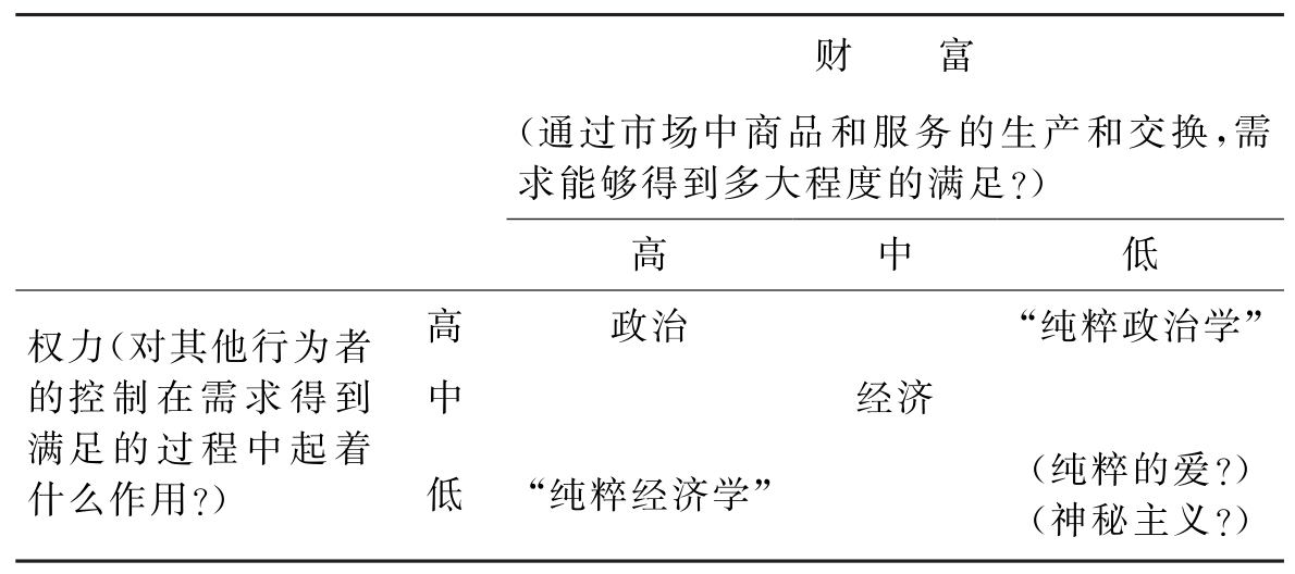 虽然如此,把国际政治经济学界定为追求财富和追求权力之间的互动,从描述的意义上讲仍然不乏用处。我们可以把国际政治经济学看作是经济学所研究的各个独立领域的交汇点:市场上可买卖的获得满意手段的生产和交换过程,这个过程同时也是政治的中心问题,因为它深受权力因素的影响。因此,不管行为者是在什么样的经济领域中互相施展着权力,经济问题同时也是政治问题,这是毫无疑问的。相对应的是,我们这里所说的相互交汇的领域,与纯粹经济学所研究的领域是不同的,在后者那里,没有一个行为者可以对其他行为者施行控制,每个行为者面临的都是一个被决定了的外部环境。当然,人们还可以设想这样一种状态,也是一种理想的状态,其中非经济资源仅仅被用来追求那种无法在市场上实行交换的价值,如地位及权力本身,这种状态将是一种纯粹的政治学状态。表2.1概括地说明了上述问题。