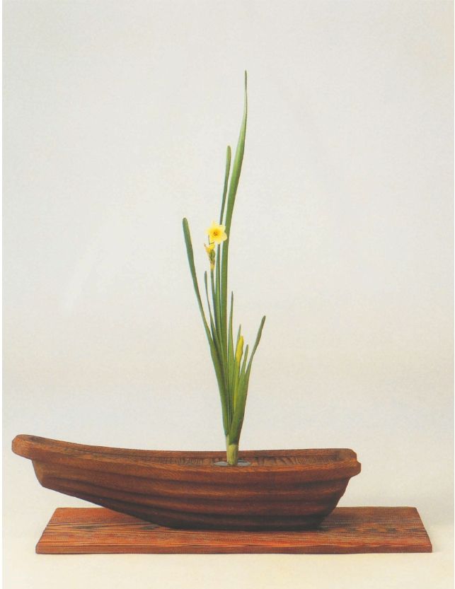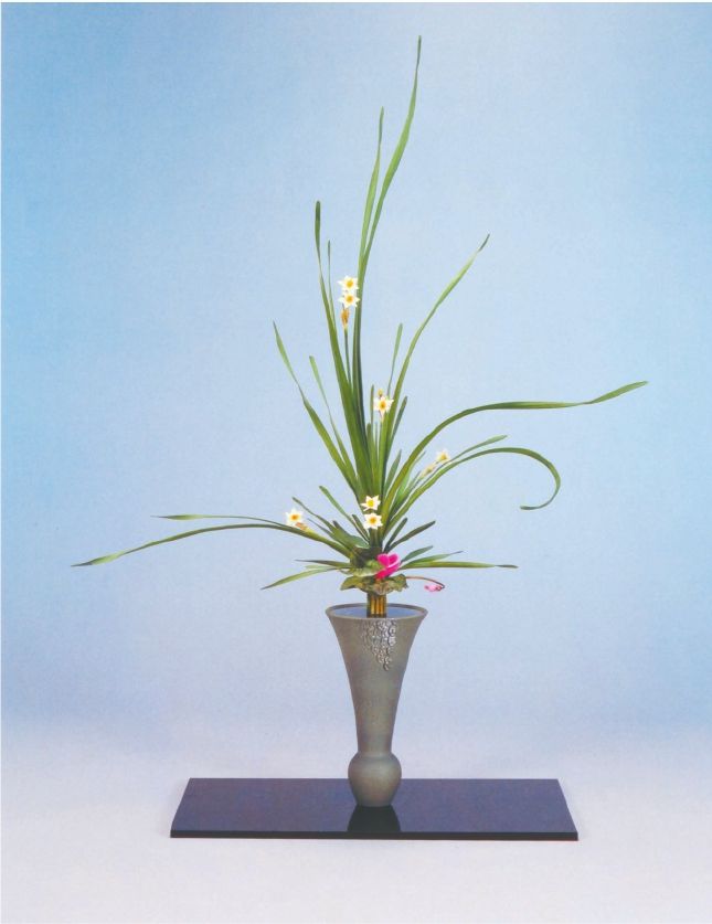 在日式花道里,水仙也占有一席重要的位置。在研习水仙花的作品中,采用完全不同于其他植物的插置方法。水仙生花的作品,由两株到三株水仙组成,分别都有四叶一花。从图片中可以看到,层层叠叠错落有致的叶片,被花道师按着叶片自然生长的规律,将叶片与花的高低错落位置重新组合,把理想之美传达给观赏者,整个作品传达出水仙挺拔清雅的春之韵。