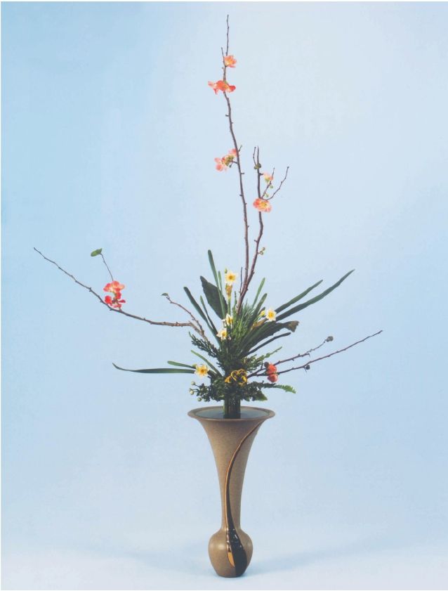 这幅(图四)层层叠叠、错落有致、饱满的插花作品,就是池坊的立花,在花道中这个花型有着自己的名字,叫水仙一色。在这个作品中,我们可以欣赏到水仙那优雅曲直的线条,在整个作品中有秩序地四散开来,犹如一瓶正在绽放的烟火。