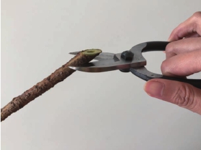 步骤三 再裁剪一枝较为瘦弱的雪柳,使用与步骤一/二同样的方法,斜插在粗壮的雪柳的右侧,往右探出,将整个作品的重心拉向右侧舒展开。