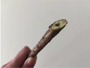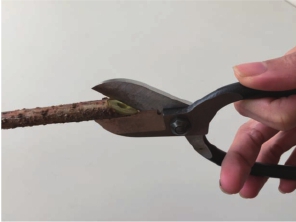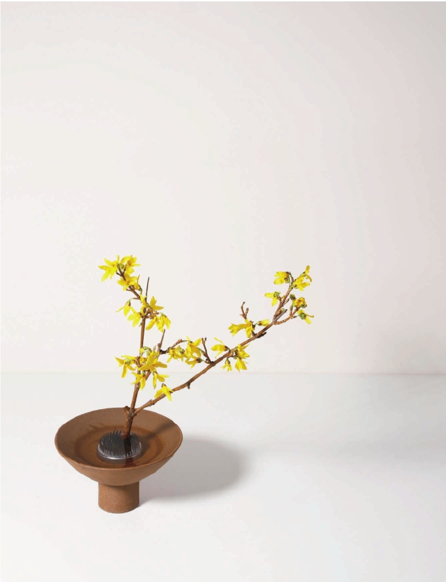 步骤一 剪一枝连翘,长度大约是花器口直径的2倍到2.5倍。太高会显得作品头重脚轻,有失衡感。