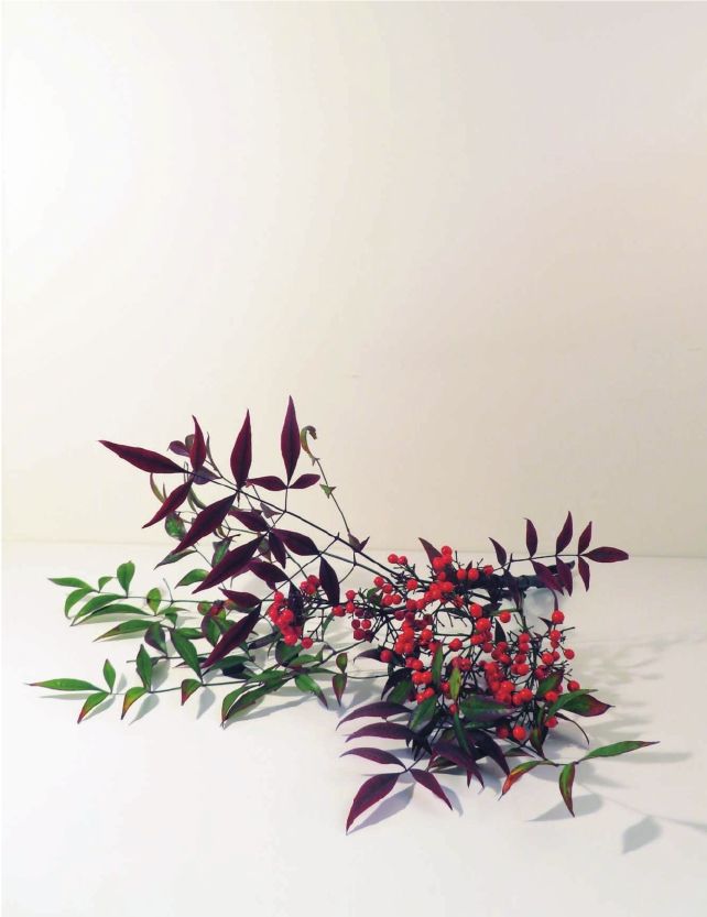 大家对南天竹可能并不陌生,纵观这本书,南天竹出现的频率也是相当高的。因为它一年四季,叶片有着不同颜色的变化,还有靓丽的红色果实,深受插花者喜爱。