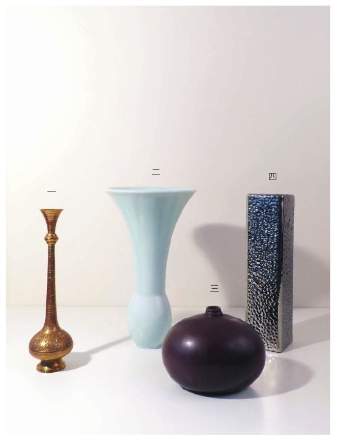 本节所用的花器,分别是不同风格,花器一是一款有印度风格的细颈铜花器。花器二是一款比较偏日式的尚如青瓷花器,花器三是偏现代风格的中式的小口花器,花器四是一款当代的直立式花器。