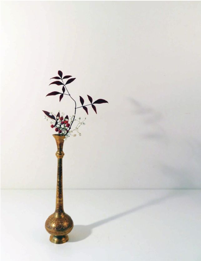 第一款花器颈部细长小肚,整个花器造型显得修长,我们选用的是一小枝南天竹,高度大约为花器的1.5倍,不宜太长,否则整个作品会过高而显得重心不稳。在瓶口处我们加上一枝零星几颗红色的南天竹果实,在瓶口处又多加了一小枝满天星,使整个作品在瓶口呈现出更多的层次感,本身厚重的铜花器和插花作品之间,有一种虚实对比的感觉,会让这个作品更加灵动。如果手边并没有满天星,可以找一些类似这种轻盈感的植物插在瓶口处过渡。