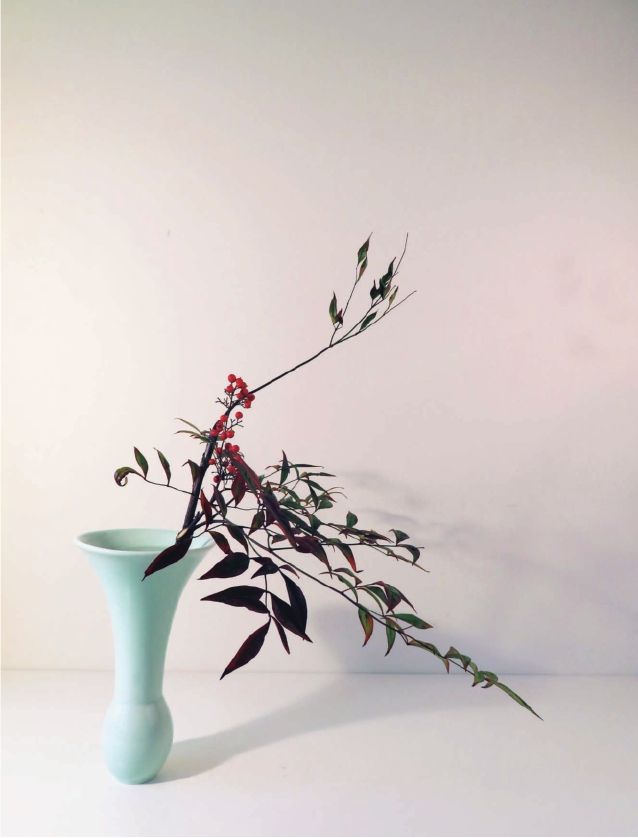 第二个花器瓶口较大,而底部收紧,偏挺拔直立。我们择一枝较大的南天竹,高度略高于花器,修剪去一边的枝条,只留出一侧的枝叶,保留果实部分斜靠在花器口处,制造出倾斜感。但仅插一枝在这个花器里,会显得过于呆滞,并没有把这个花器挺拔的直立感表现出来。再挑选一枝南天竹,修剪掉大部分其他枝叶,仅留一个侧枝上干净的线条与叶子,整体高度大约是花器的两倍。这样一来,整个作品的重心被拔高了,作品的上部也添加了空间感,整个作品飘逸挺拔,是这个花器本身要表达的感受。要注意的是后添加的这枝南天竹所留的花枝和叶的部分,要尽量的轻盈,不可以过多,否则整个作品也会削弱轻逸之感,这时的取舍也是非常关键的一次修炼。