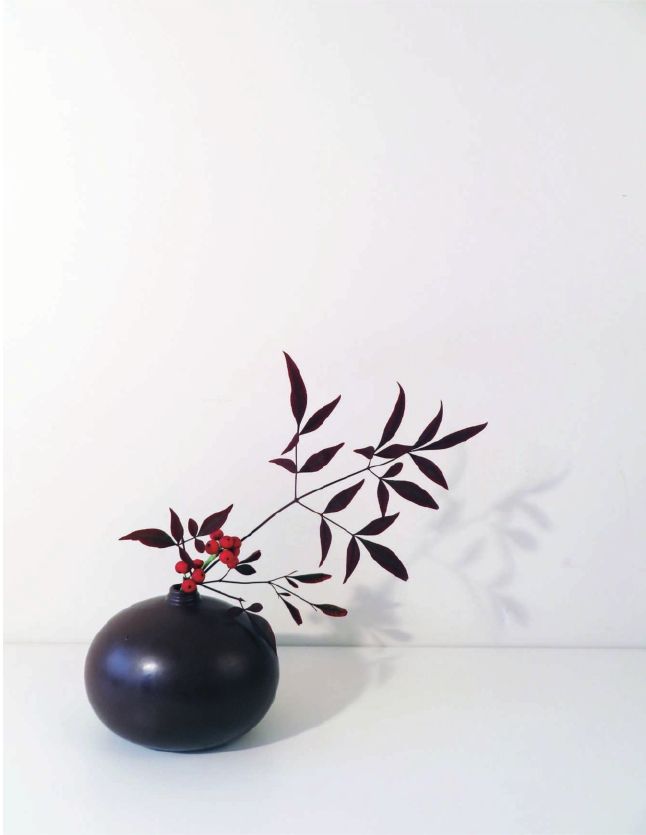 第三个花器的颜色偏棕褐色,所以我们选用一枝与花器颜色相近的叶片。因为这个花器整个造型偏厚重敦实,所以在花器口飘出部分的枝条,约为花器的两倍即可,注意这个作品中不要把叶片修理得过于稀疏或是轻盈,而应更多保留住原有的叶片,在瓶口处加上一枝低矮的鲜红色的南天竹果实,让整个作品的颜色更为鲜亮。在瓶口处再往斜前方添加一枝南天竹的叶片,颜色也与第一枝相类似,并在红色果子的斜后方也添加一枝南天竹叶,这样整个作品与花器,不论在颜色和形式上都有你中有我、我中有你的整体感,没有破坏花器本身的敦实厚重,而向外一侧探出的枝条,让这种敦厚感有一个向外延展的空间,红色的果实更是整个作品中画龙点睛的部分,灵动丰富,在颜色上提亮了作品的一个层次。