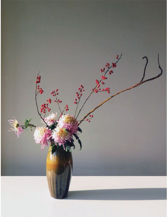 步骤九 在左侧靠近瓶口处的空间里,我们插上几枝金黄色的小菊花,能将叶片和底部较暗的空间填补一些颜色。在上部分的空间中,投入几枝石化柳,挑选线条粗细状态不尽相同的,穿插在冬青果之间,既丰富了空间层次,节奏上也更有天趣生动。