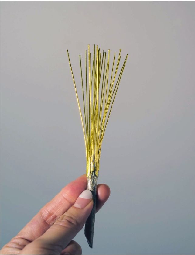 步骤一 将金色的铁丝剪出若干根,一头用干树枝卷起固定好,将剪好的铁丝段一条条地平铺在透明胶上。然后像卷纸一样,一点点地把它们卷在木棒上,用透明胶粘好固定好。可以用手指轻轻地将铁丝向外掰,形成一个以木棒为圆心伞状的骨架型。