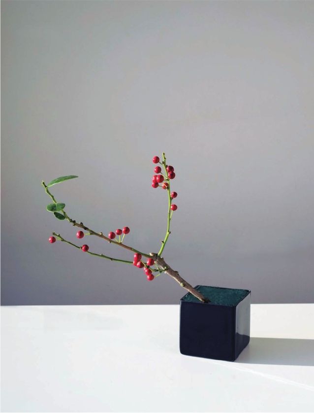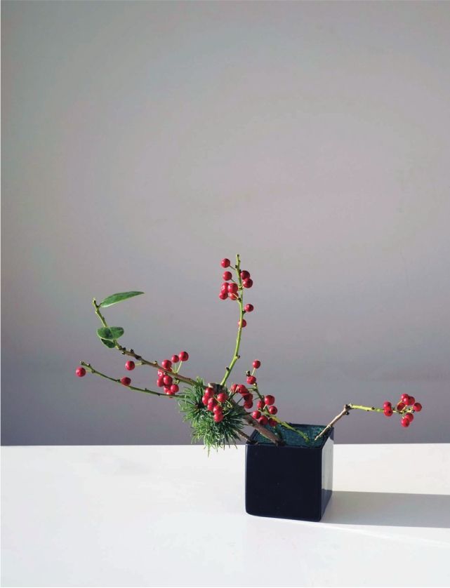步骤二 剪一枝较粗壮的冬青,长度可以为花器高度的2.5倍,插在花泥上,往左前方倾斜,大约与花器呈45度斜角。