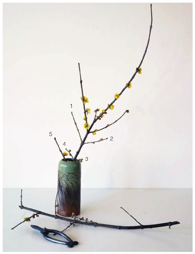 步骤二 我们先将瓶口杂乱的短小的侧枝线条3、4剪干净,中下部分没有花骨朵和花的那两枝(1、2)也剪去。在瓶中转动Y字形的花枝,让Y字型分叉显得没有那么明显,整个枝条有了聚拢感,最后去掉瓶口的最后一枝5.