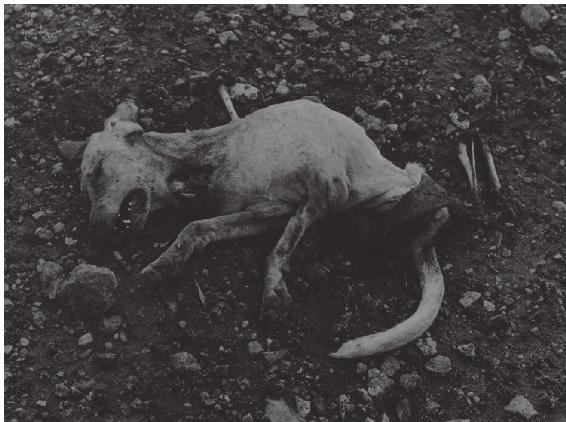 四张静物照片的组合:《一箱破损的洋娃娃》《一条烂得只剩半身的死狗》《盘子上盛着断头雕像》《阁楼角落一幅前额破了洞的老画像》……