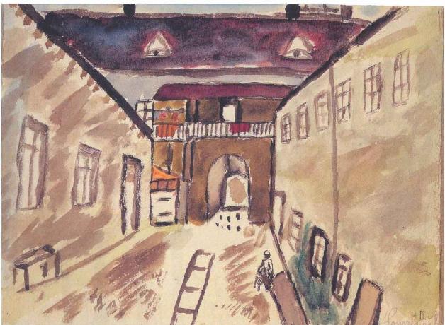 他在特莱津用墨水和水彩颜料,在一张用过的纸上,画了这幅画。这不仅是一张特莱津现实场景的描绘,他也画出了自己对特莱津封闭、压抑的感觉。