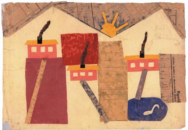 这是一张上色的剪贴作品,用了当时作废的表格纸,贴在一张发亮的黄色纸上。这张剪贴作品的构图、变化和虚实处理都很好。这是艺术化的特莱津景观。