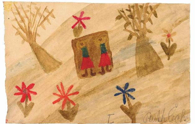 鲁特是个女孩,一九三一年四月十九日,她出生在捷克的布尔诺。一九四三年三月十九日,在距她十一岁生日还有整一个月的那天,鲁特被遣送到特莱津。在特莱津犹太人博物馆的儿童画收藏中,有鲁特留下的十二张画作。有粉彩,有水彩,有铅笔素描。她的大多数画作,都是在一九四四年四月至六月之间画的。留给她作画的时间是那么短暂,一九四四年十月十九日,十二岁的小女孩鲁特,被杀死在奥斯威辛集中营。