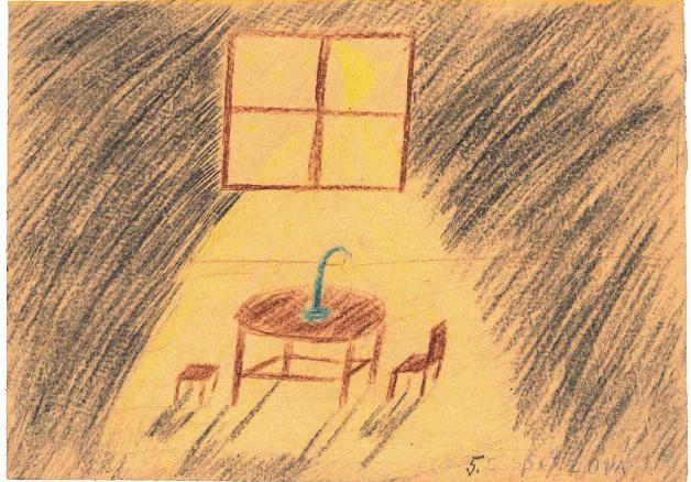 这张画没有像前一幅作品那样,直接地描绘警卫、棍子以及站在威胁面前的特莱津囚徒,而是画了一个非常静谧的场景。然而,这幅画却更深地打动了我。一个小女孩画出了这样一种心情,表达着包围在她四周的黑暗和她内心的惶惑。她又害怕黑暗,又希望在黑暗中隐藏起自己。那空无一人的、孤零零的桌椅台灯,传达着无法挣脱的孤寂。但她并没有被窒息,那微弱的星光,就像希望一样,透过唯一的窗户,在黑暗中引导,点出一条出路。