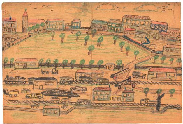 约瑟夫一定是个城市孩子。他在画中仔细地描绘了一个城市的边缘。他一定也像许多男孩一样,喜欢火车,所以,他的记忆中才会有那么多的细节。在家的时候,他一定常常去看他喜欢的火车。可是,他没有想到,遣送的火车把他的生活送上了另一条轨道。