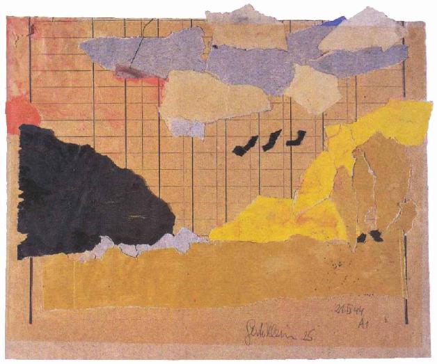 这张画也是利用废旧的表格纸做成的。几个非常简单的色块,就成为一张美丽的风景画。被那块黑色的山一压,画面就稳住了,而山后半露着脸的太阳,又打破了这黑色带来的沉闷。那一点点黑色的飞鸟和树干,在另一个方向作出了呼应。