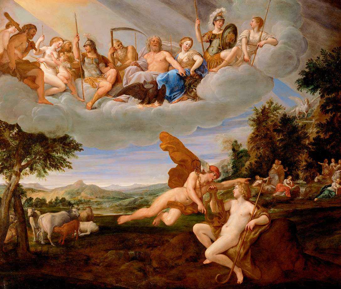 当太阳神费尽周折终于追踪过来时,赫尔墨斯四脚朝天地躺在摇篮中,狡辩自己是多么的小,甚至都不知道牛是什么样子。愤怒的阿波罗发狠说要把他打到塔耳塔洛斯(地狱)中去,但毕竟心有忌惮,就把这小流氓拎到了他们共同的父亲宙斯面前告状。