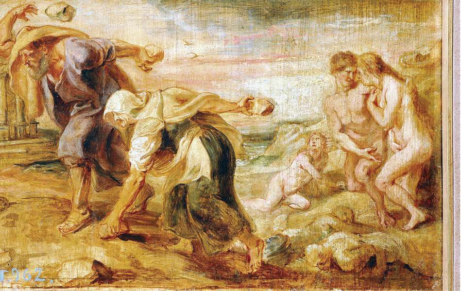 丢卡利翁夫妇跪在地上,孤独恐惧地向神献祭和祈祷。这时天上传来庄严的启示:“解开衣服蒙上头,将你们母亲的骸骨投掷在身后。”皮拉大为震惊,认为不能如此亵渎母亲。但丈夫显然更长于哲学思维,他相信所谓母亲的骸骨就是石头。于是夫妻解衣蒙头,捡起石头投在身后。奇迹发生了,身后的石头自动柔化成形,石质化为骨骼,纹理成为血脉,石头上的泥土变成血肉。丈夫投出的石头变成男人,妻子投出的石头变成女人。也许妻子在捡石头时偷懒,并且喜欢鹅卵石之类,所以后来这个世界上女人少些、小些、圆润些。至于贾宝玉那样的石头可能是妻子捡起来,爱不释手,丈夫很生气,抢过去扔到了十万八千里之外的东方。