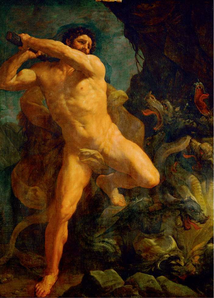 第二件,消灭九头蛇许德拉。许德拉也是堤丰与厄喀德娜的女儿,狗身蛇头,呼出毒气,而且头有九个(有人说是一万个),其中一个是不死的。赫拉克勒斯带着侄儿伊俄拉俄斯赶到勒尔涅的沼泽地,用烧红的箭镞引蛇出洞。妖蛇以尾立地,鳞光闪烁,嘶嘶怪叫。大英雄踏住蛇身,用木棒将蛇头一个个击碎。但击碎一个,生出两个(类似今日游戏厅里的砸地鼠游戏),沼泽里还爬来一只巨虾帮凶。赫拉克勒斯令侄儿以燃烧的木头烙妖蛇的伤口,蛇头终于不再生出。然后又击落了不死的蛇头,压在巨石下。令人气愤的是,国王欧律斯透斯以有人帮忙为理由,宣布这件功绩不算数。赫拉克勒斯从中得到的唯一好处是把箭镞沾染了蛇胆或蛇血,从此中箭者无药可治。这毒箭位列西方生化武器兵器谱,后来流传到特洛伊战场上,射死了风流王子帕里斯。